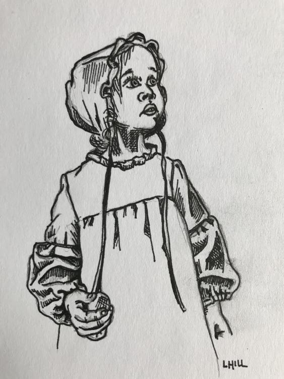 This delicate ink drawing captures the quiet wonder of childhood. The little girl—dressed in a simple bonnet and gathered sleeves—looks upward with a mix of innocence and curiosity, giving the piece a timeless, storybook quality. The expressive linework brings warmth and tenderness to the figure, reflecting the gentle emotion that characterises much of her work.